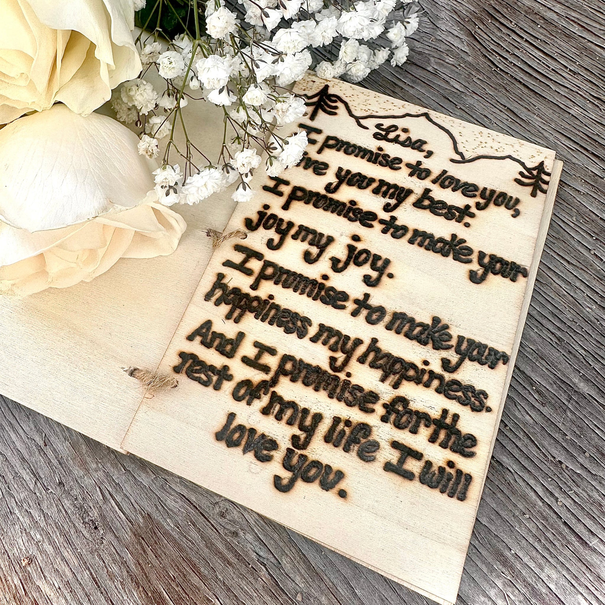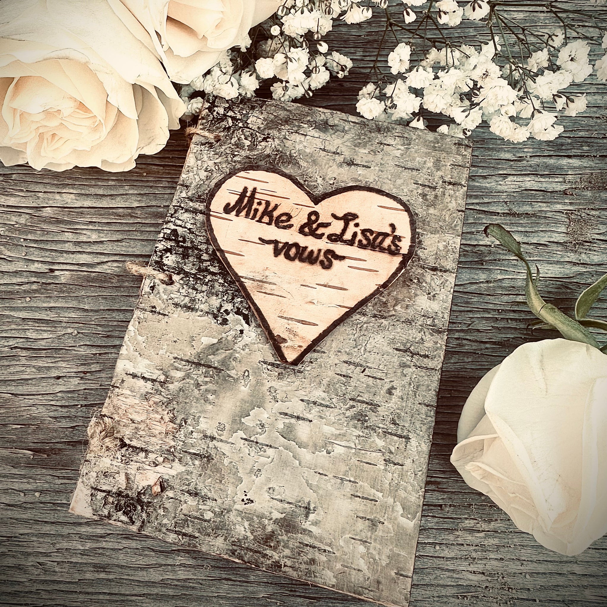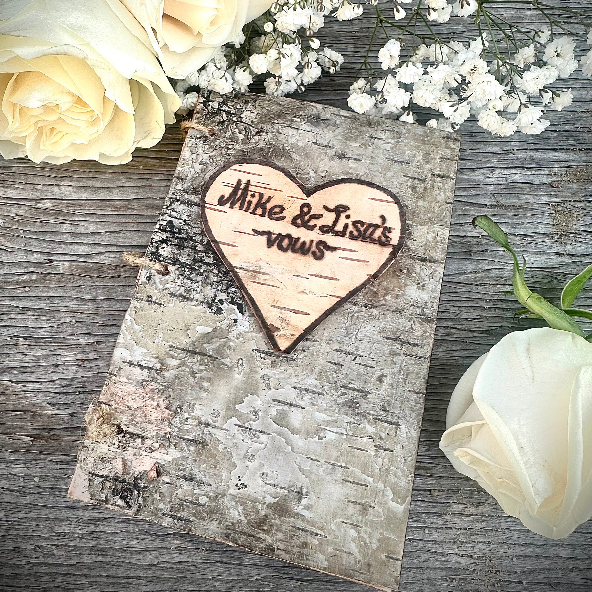 This birch bark vow book is truly a one of a kind wedding accessory/ keepsake. Have your vows engraved into pine wood to keep them safe. Most vow books will yellow over time and may become harder to read but wood engraving lasts forever.
